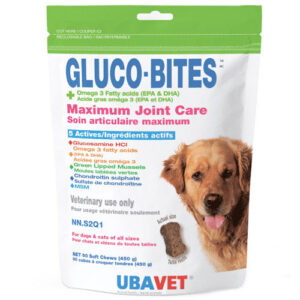 GLUCO-BITES by UbaVet are soft chews that contain Glucosamine, Chondroitin, MSM, Green Lipped Mussels and Omega-3 Fatty acids in a treat form that dogs and cats love.